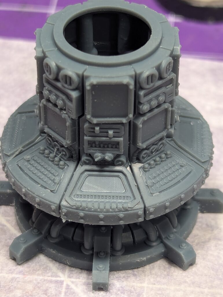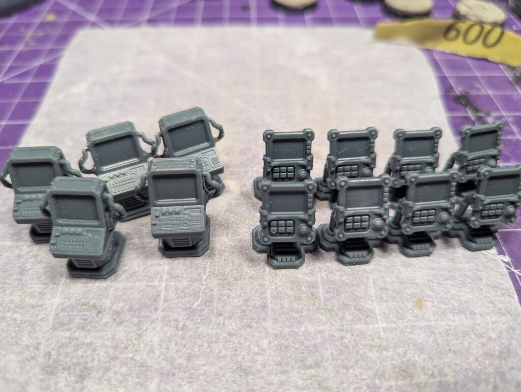 First off, while Custom Miniature Maker does a Tau-themed texture, I wanted something a bit more synthwavey. Their cyberpunk roller did just the trick. Then, because I wanted some base bits and needed to pose some of the models a little more dynamically, I needed some computery things I could print and saw and glue. Print Minis’ Computer Consoles was cheap and effective. Some sculpey, some glue, and I had the bases I needed.