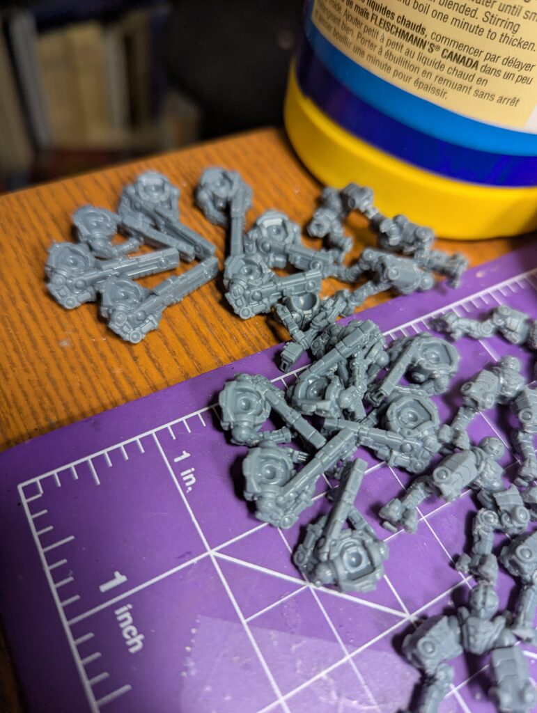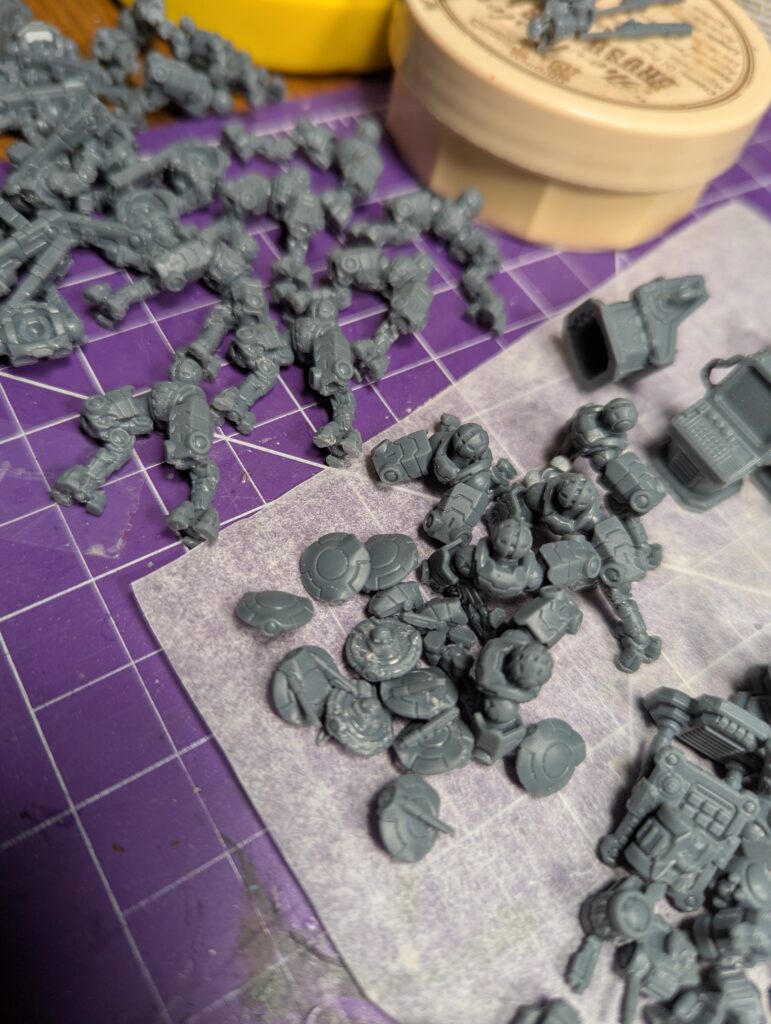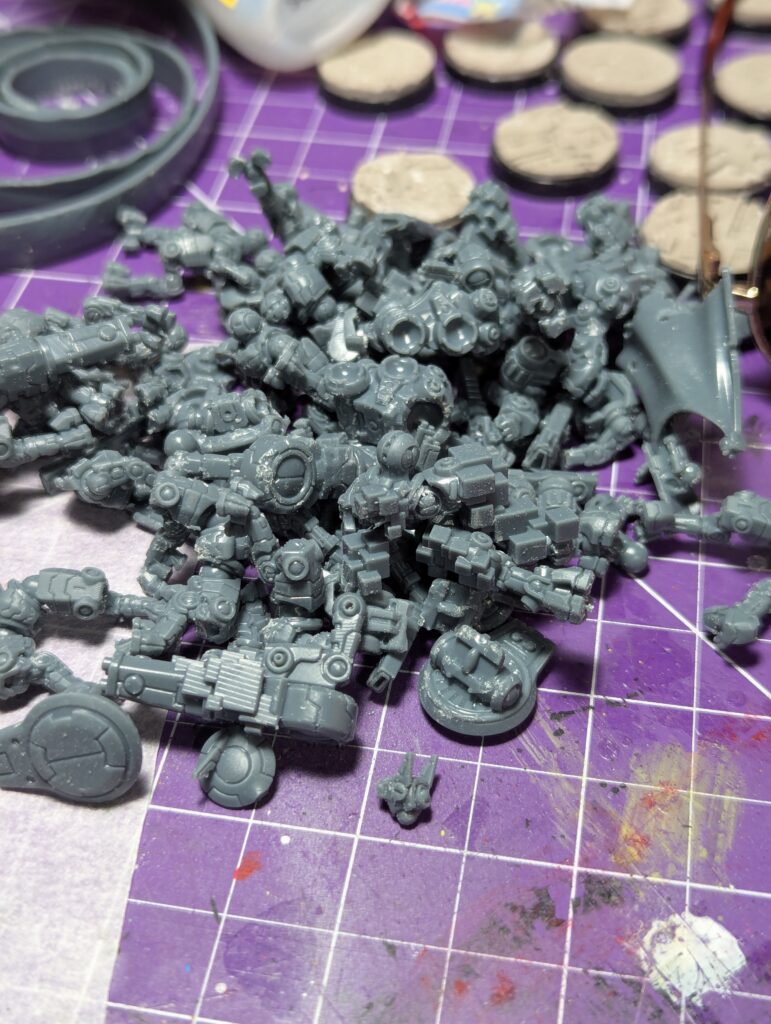 Now I’ve got bendy prints thanks to a 20% doping with Siriyatech Tenacious, and a much better grasp of colours. So, I’m tossing the old models and reprinting everything. And, since I’m subbed to Piper for her FishMech reruns, I’m also getting every model from that line, so I may as well print myself a whole army. First up, a re-do of my synthwave infantry, WYSIWYGed against the OPR 3.5.1 ruleset. That means I’ve got a grunt leader with a squad of tactical grunts and two squads of security grunts. All of whom need bases.
