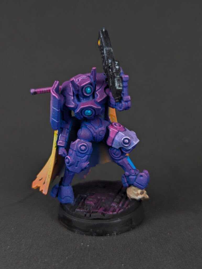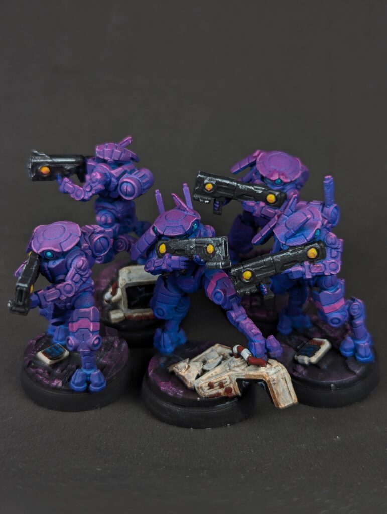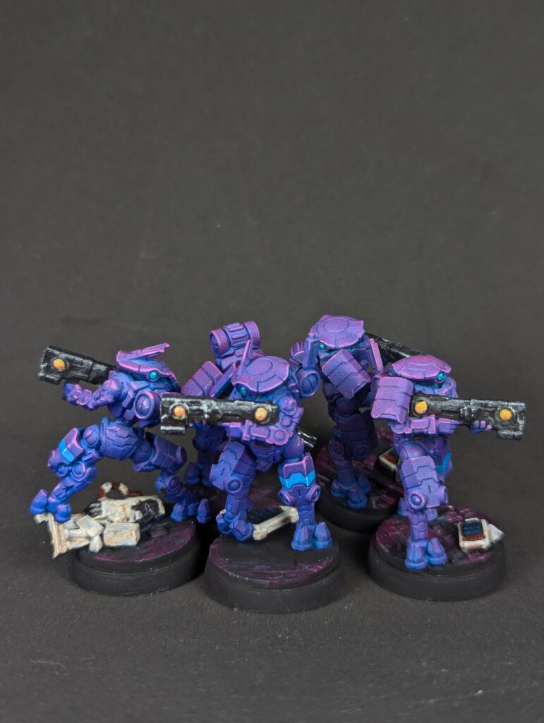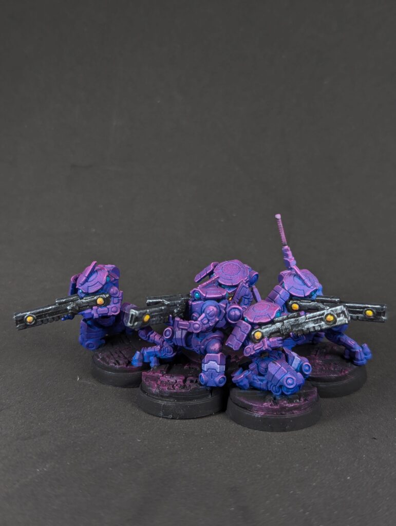 Nice turquoise eyes and some yellow/orange weapon orbs round them out visually. I feel confident abandoning the old 70/20/10 colour ratio rule because of experience now, but I’m still pushing “mostly purple, little bit of blue, splash of yellow” and I’m happy with that. The bases finally got some love. Black, then a silver drybrush, then a magenta drybrush over the silver for that sort of synthwave “magenta grid” look. The computers got an off-white “90s Compaq plastic” followed by a dark brown wash and dark red features. I realized later this made a visual statement about classic Tau Vior’la, but that’s as much a happy accident as the fact these little suckers are repping the bisexual flag as hard as they can. Which has given me some fun ideas for other units in this army. After all, the DAO aren’t Tau, nobody says my army has to have the same colours- that’s just tradition! But I could do bisexual pride infantry, and demi/ace stealth units, and NB heavy assault. And since their bases will stay the same and they’ll all have some purple on them, that’s enough visual coherence for me.