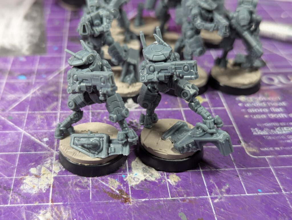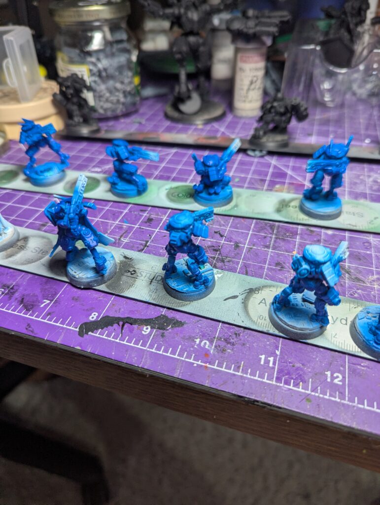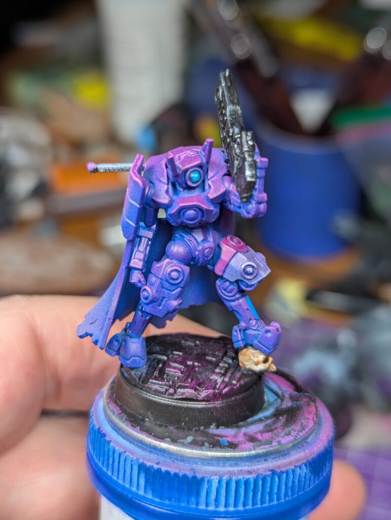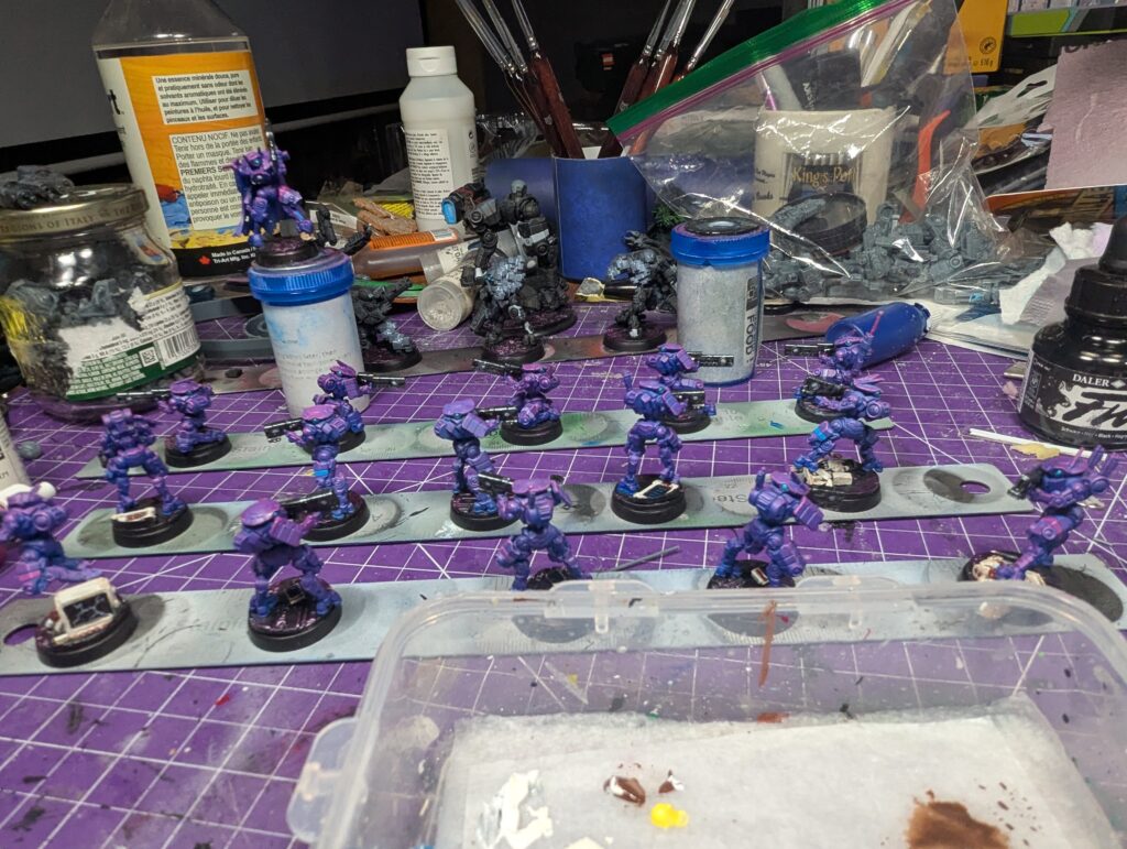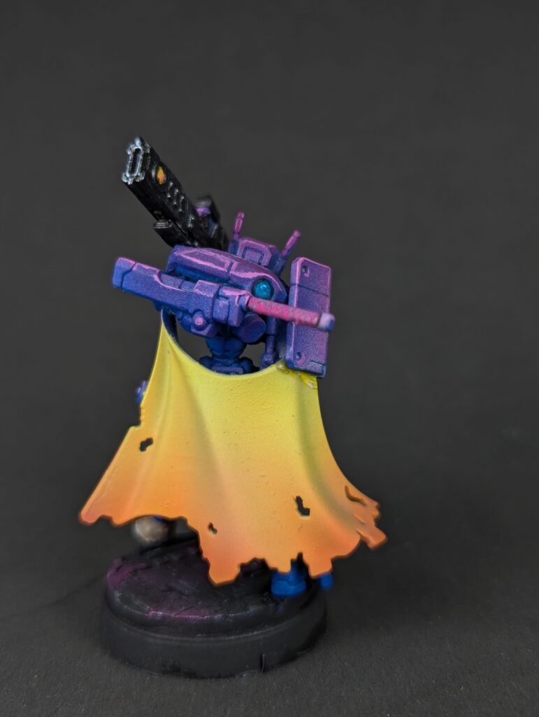 Nice turquoise eyes and some yellow/orange weapon orbs round them out visually. I feel confident abandoning the old 70/20/10 colour ratio rule because of experience now, but I’m still pushing “mostly purple, little bit of blue, splash of yellow” and I’m happy with that. The bases finally got some love. Black, then a silver drybrush, then a magenta drybrush over the silver for that sort of synthwave “magenta grid” look. The computers got an off-white “90s Compaq plastic” followed by a dark brown wash and dark red features. I realized later this made a visual statement about classic Tau Vior’la, but that’s as much a happy accident as the fact these little suckers are repping the bisexual flag as hard as they can. Which has given me some fun ideas for other units in this army. After all, the DAO aren’t Tau, nobody says my army has to have the same colours- that’s just tradition! But I could do bisexual pride infantry, and demi/ace stealth units, and NB heavy assault. And since their bases will stay the same and they’ll all have some purple on them, that’s enough visual coherence for me.