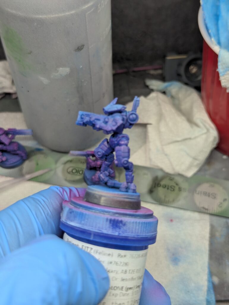 In order to get them to pop, I went high saturation. No OSL on these because there’s so many, but I could get some low lows and high highs along with interesting shadows by using blue shadows, a directional light blue spray for diffuse overhead light effect, and magenta over top for a purple base.