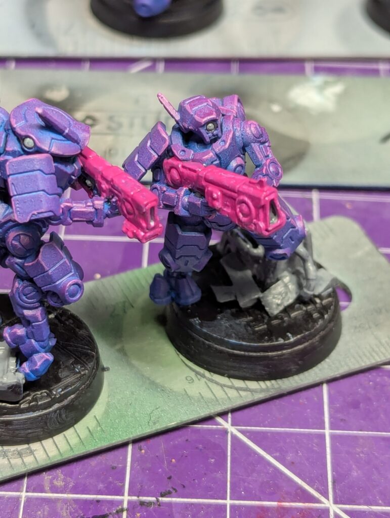 With some bright pink edge highlighting, I felt really good about my colours. I then tried to get an eye-searing pink on my guns. Which is when I remembered that magenta doesn’t cover for shit and I needed more than the four base layers of black, dark grey, light grey, and streaky white underneath to get a decent looking gun. I eventually gave up, and the ninth coat of paint was a black to hide the catastrophe, with a silver drybrush to make it look metallic. I could have airbrushed a single layer of primer, but nothing besides stripping would have saved those guns and I wasn’t gonna redo all the other work.