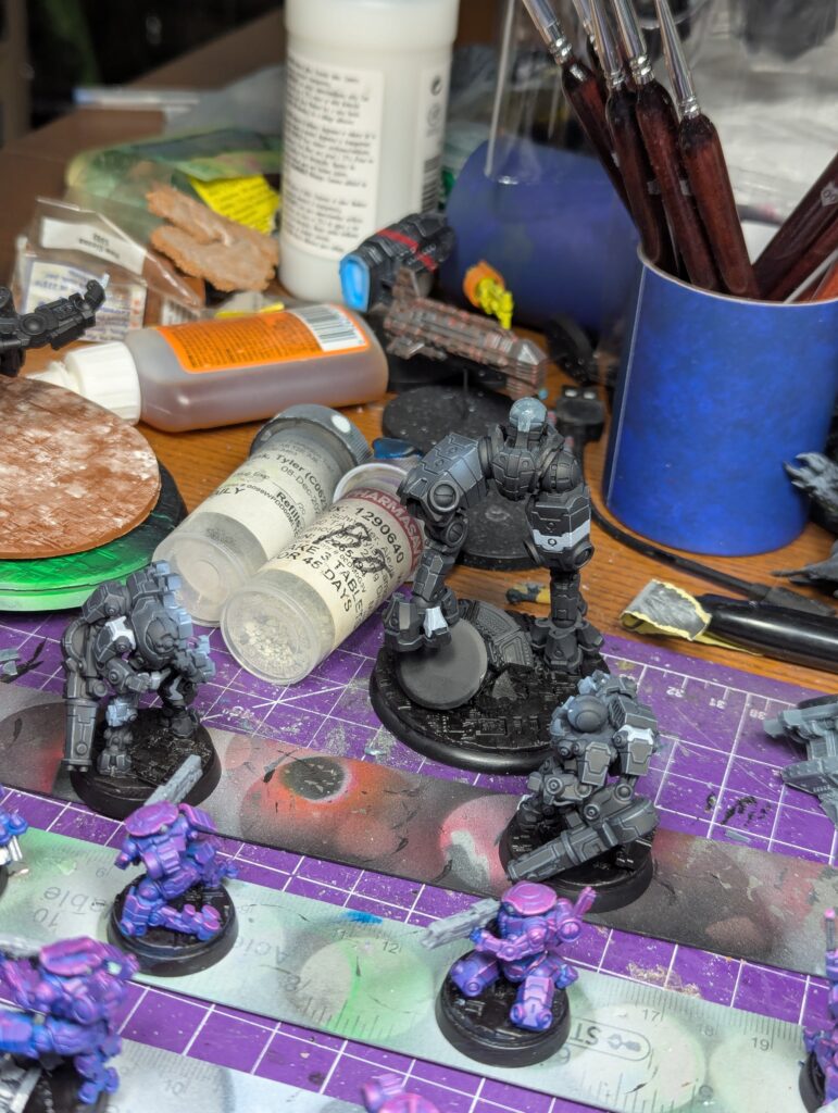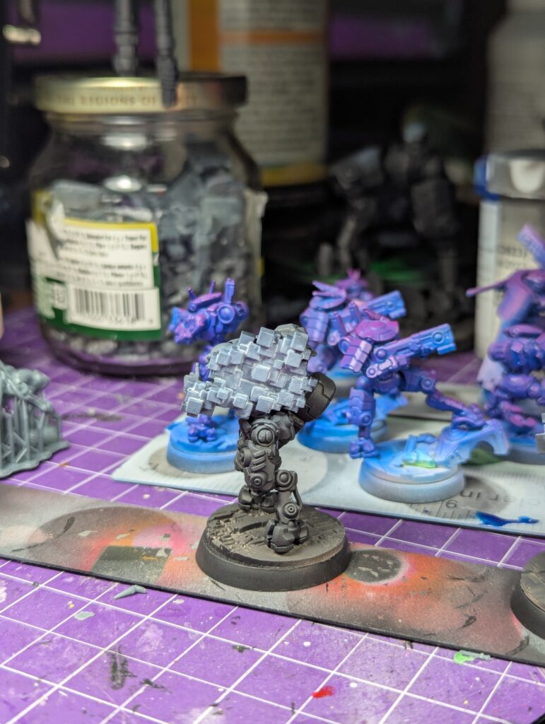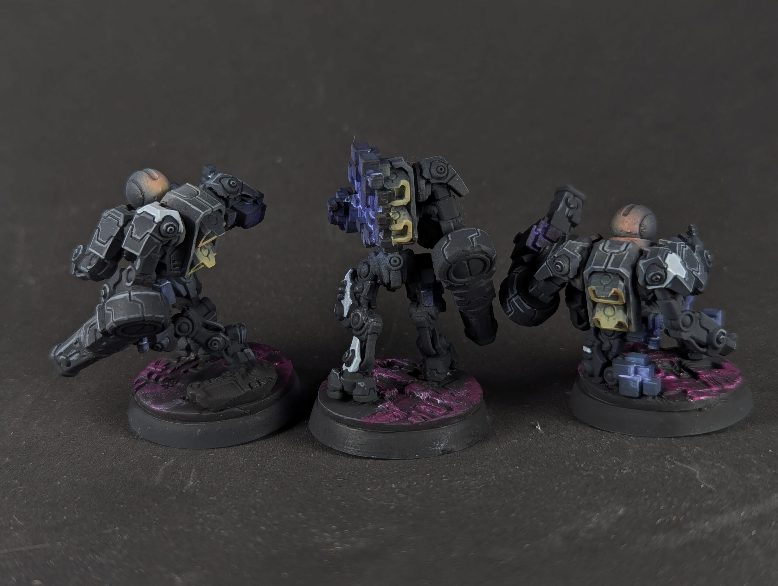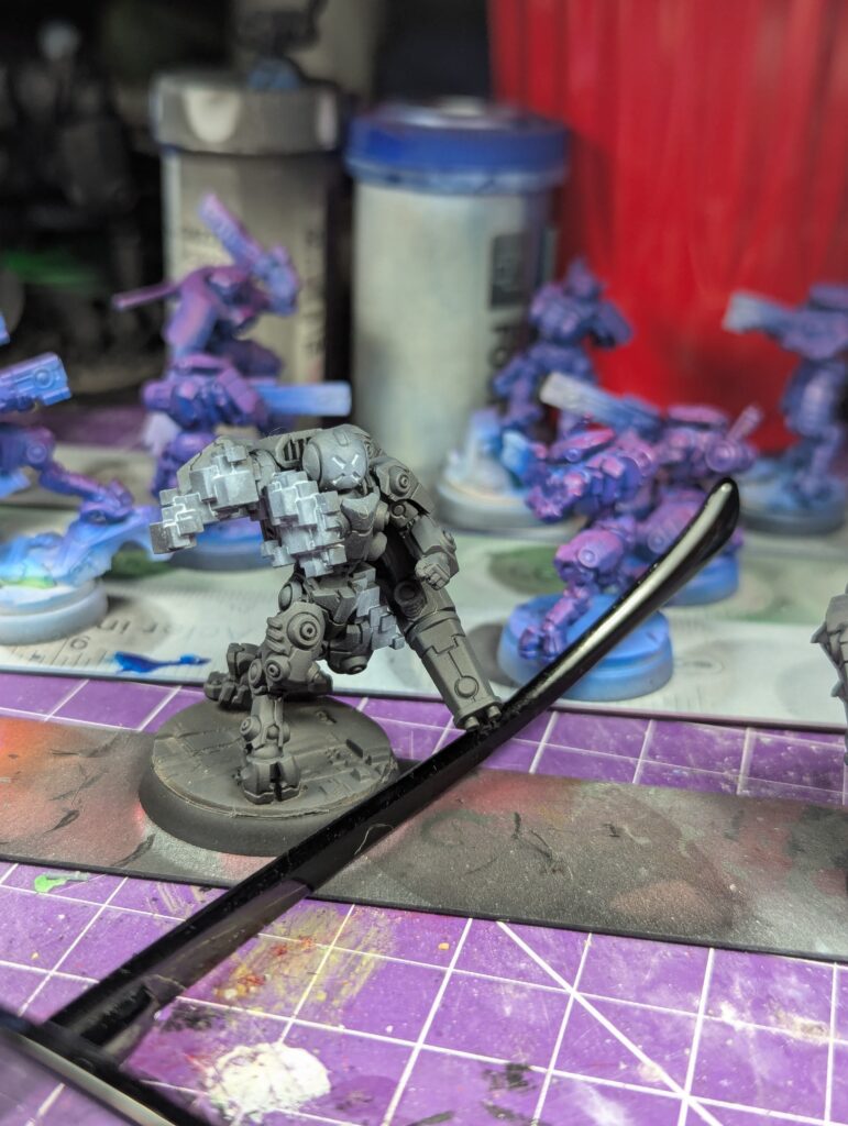 The demi and ace pride flags use mostly the same palette; white, black, (grey,) purple. There’s going to be some synthwave influence, some flying engine OSL that’s not part of that flag, but fuck it, long as I’m happy with it, right? The DAO skirmish team I’ve got set up has a single stealth suit, but my 1k and 2k lists both have 3 stealth suits and an elite battlesuit with flying and ambush and close-range buffs, so the four models together represent a single paint scheme and also my deep strike team that should chew through anything less than about 500 points in the back line. Anyway, who cares about the meta, let’s paint some dark monochrome with really bright colour on top.