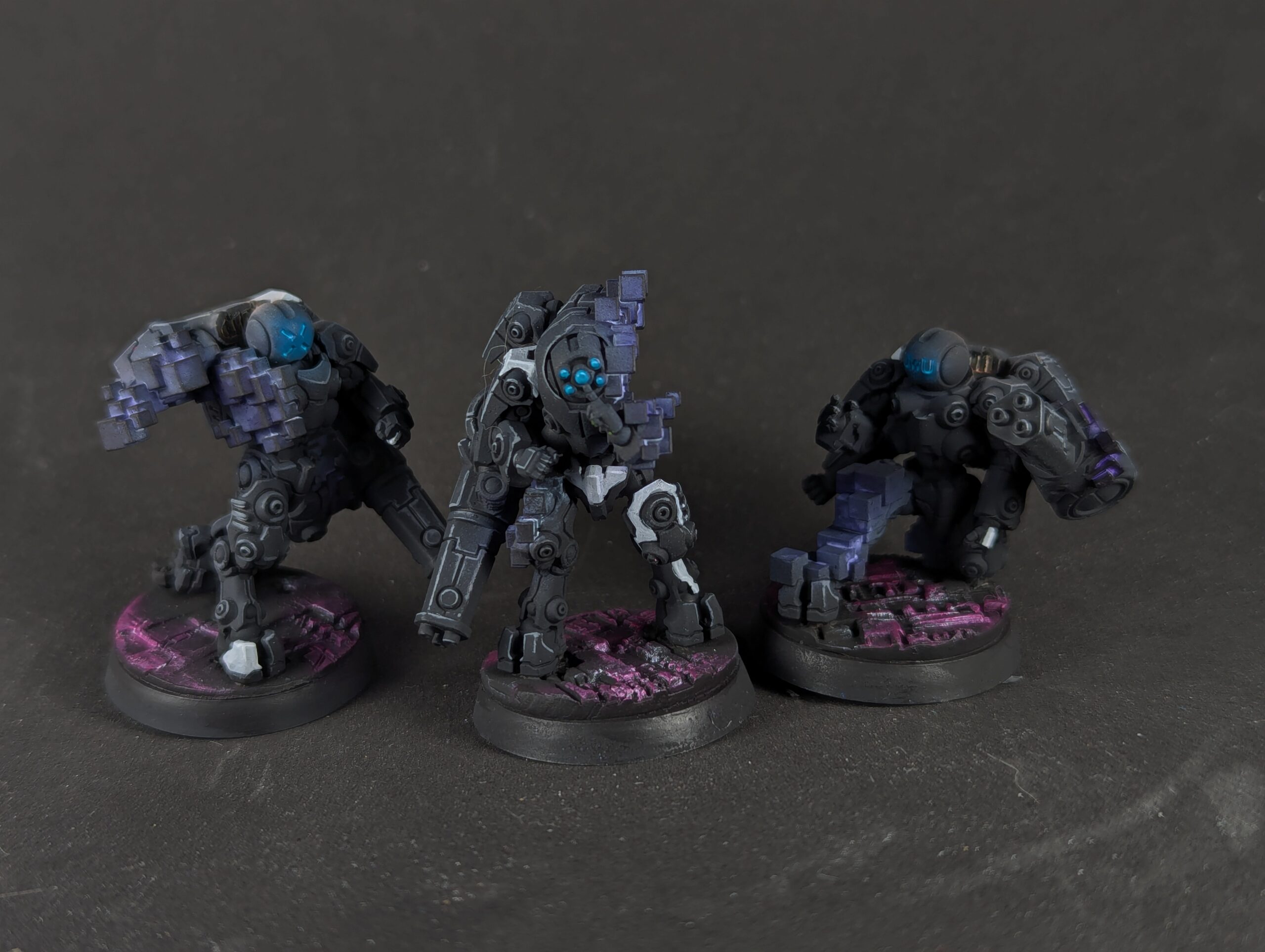 First, assembly. As ever, models from PiperMakes. These are the GhostShrimp models and the Commander Frame (with magnetized weapons because my 1k and 2k lists have different weapons and I like WYSIWYG if I can manage it). Some airbrush and white oil paint gets me the basis for that delicious internal glow.