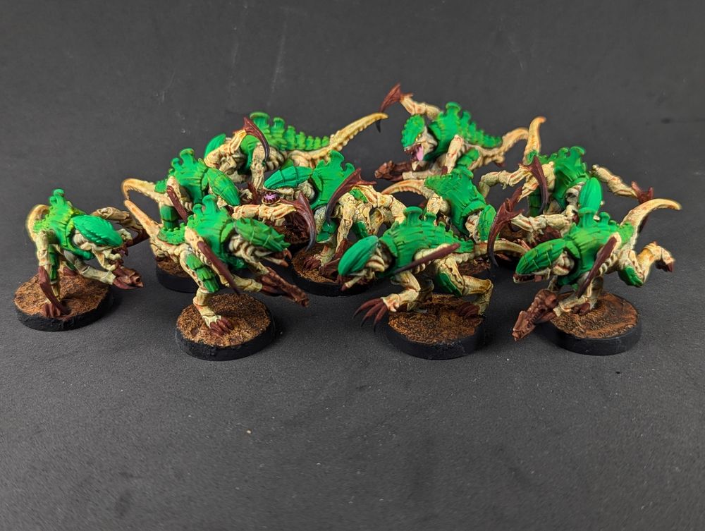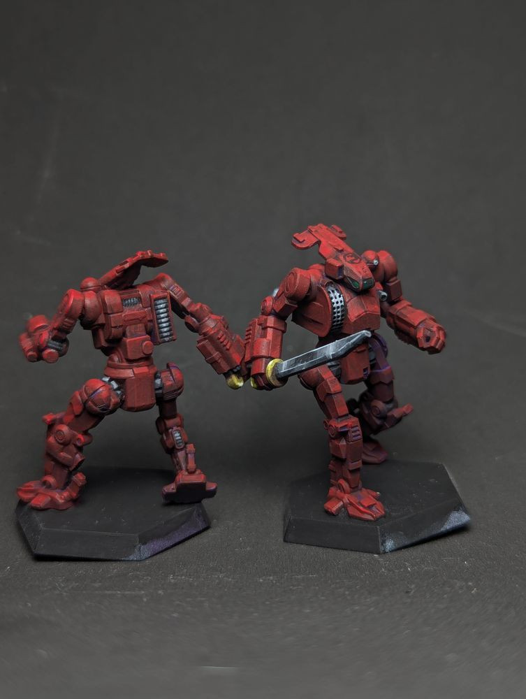 The mechs had less polish than usual but I liked the freehanding and the purple shadows were good practice for my synthwave Tau later. Also, more practice with NMM steel.